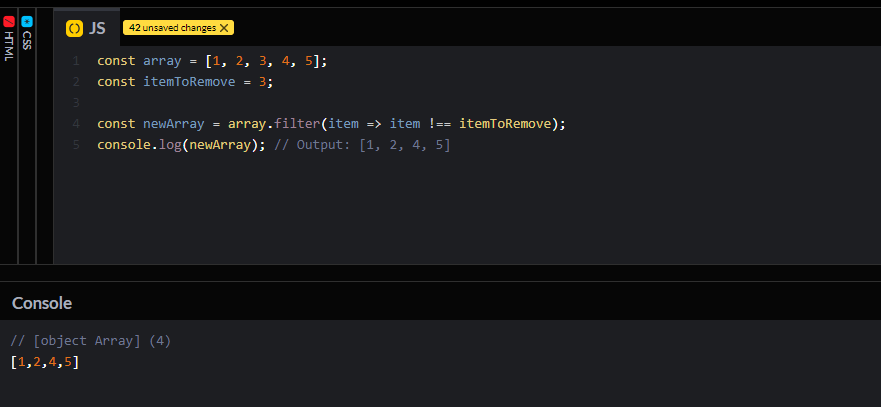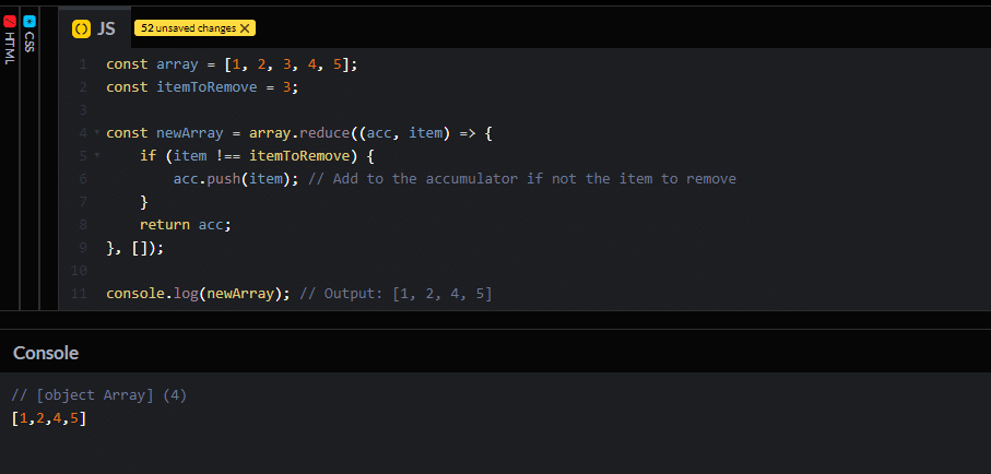 reduce()method executes a reducer function on each element of the array, resulting in a single output value (in this case, a new array). - How it works: You can accumulate values in a new array while skipping the item you want to remove.