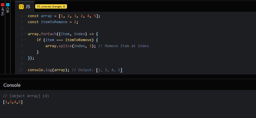 splice()to remove items. - How it works: As you loop through the array, if you find an item that matches the one you want to remove, you call